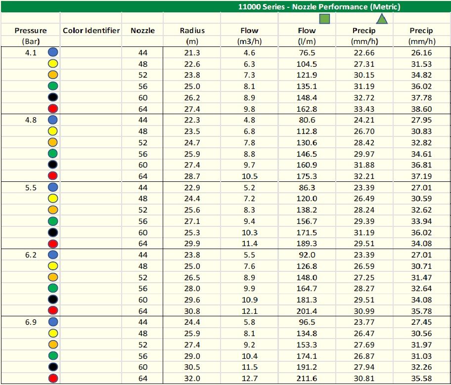 - Opposing Nozzle: Configurație cu duză opusă pentru o uniformitate sporită în imediata apropiere a aspersorului (folosit la duze aspersor Rain Bird seria 11000).