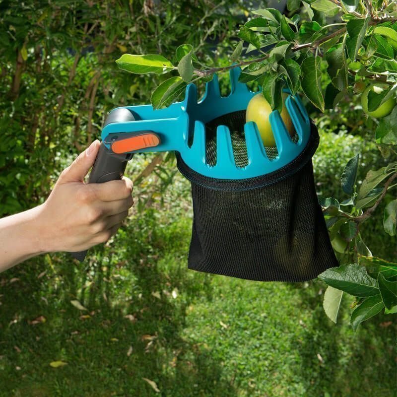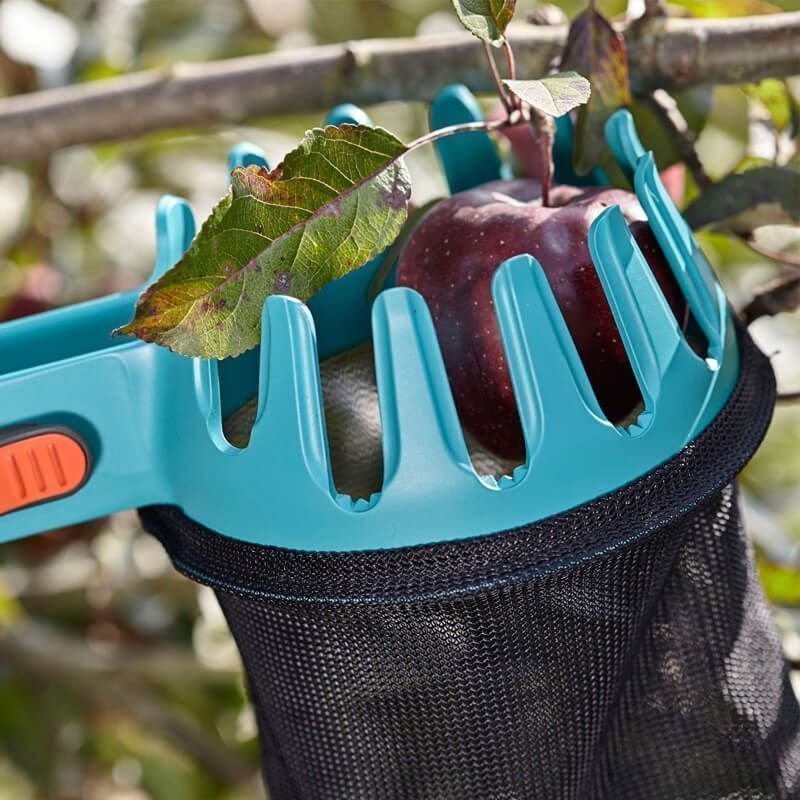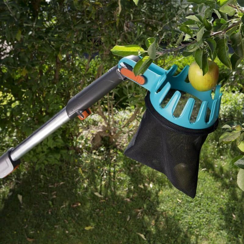 Dispozitiv de strans fructe combisystem de la Gardena asigura colectarea usoara a fructelor din copaci. Fructele sunt colectate in punga robusta, dar prin care se poate vedea continutul.