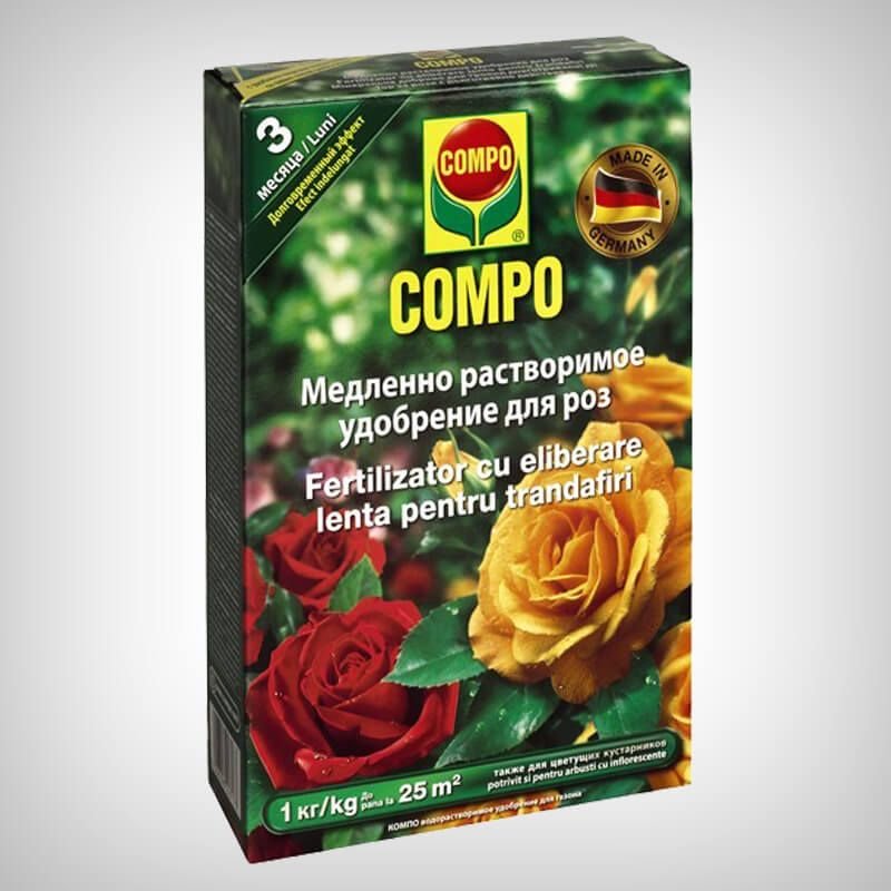 Fertilizantul pentru trandafiri de la Compo este un produs cu eliberare lenta recomandat pentru toate tipurile de trandafiri, dar si pentru arbustii cu flori (liliac, iasomie, clematita, caprifoi, trandafir japonez, plante agatatoare).