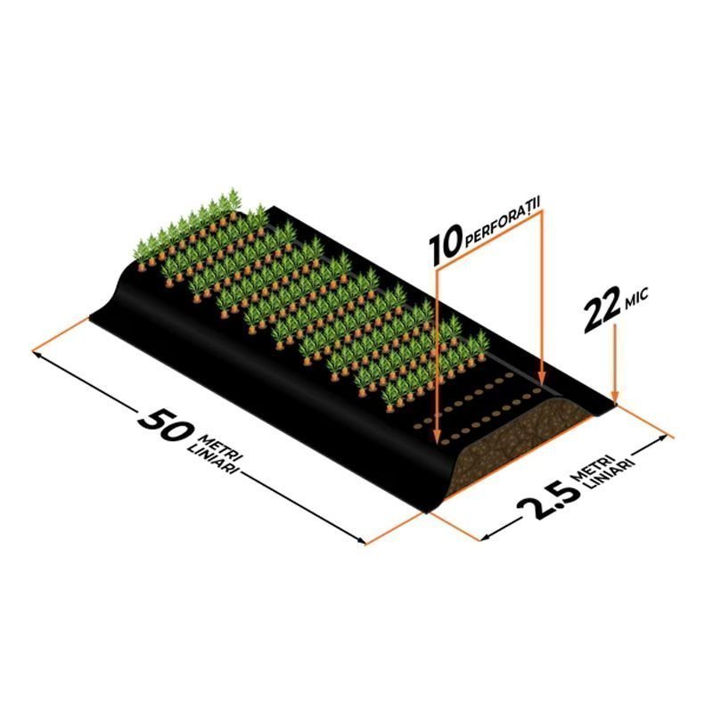 Folie de mulcire perforată, grosime 22 microni, dimensiune 2.5x50 m