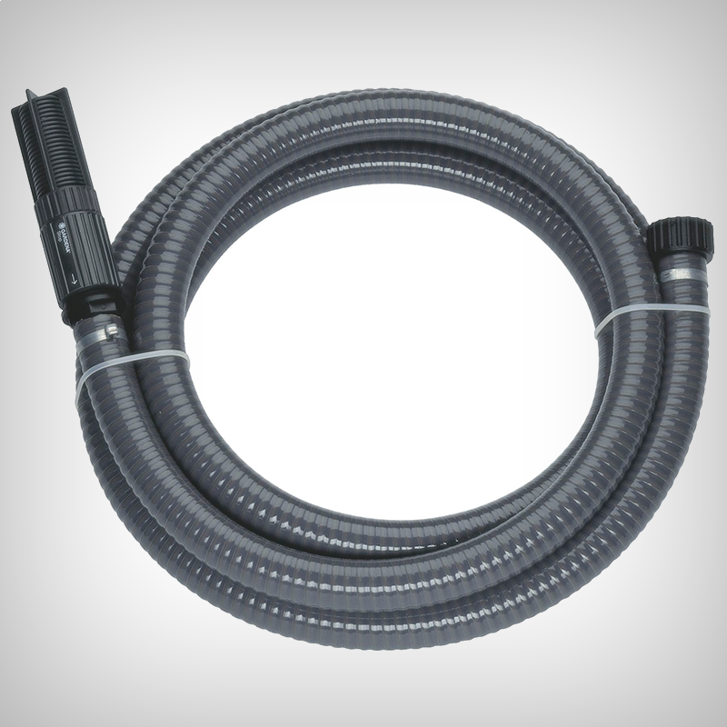 Furtun de suctiune spiralat, ranforsat, rezistent la vid, gata pentru conectarea directa la pompa.