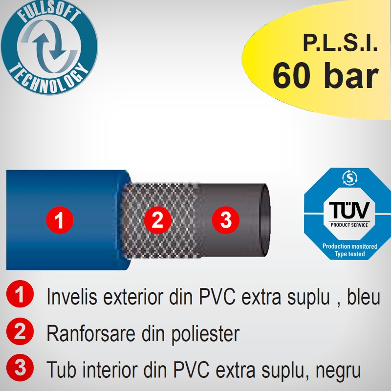 Furtunul este triplustratificat, fabricat din PVC extra suplu, ranforsat cu fibra de poliester de inalta tenacitate. Compozitia materialului, conceputa special pentru acest tip de furtun, ii confera o suplete exceptionala chiar si la temperatura scazuta, putand fi manevrat cu foarte mare usurinta.