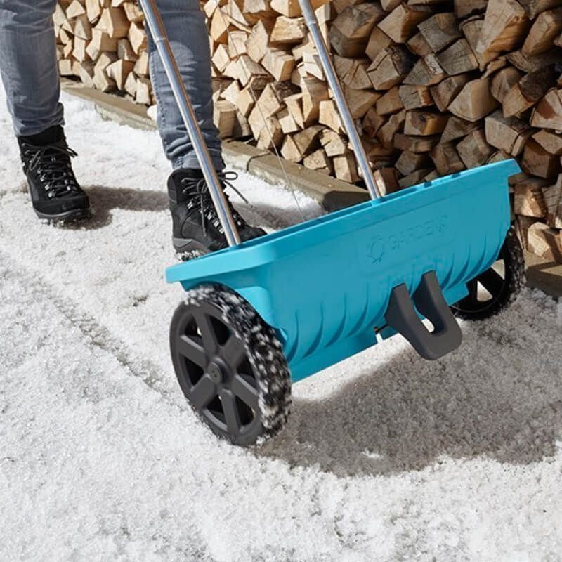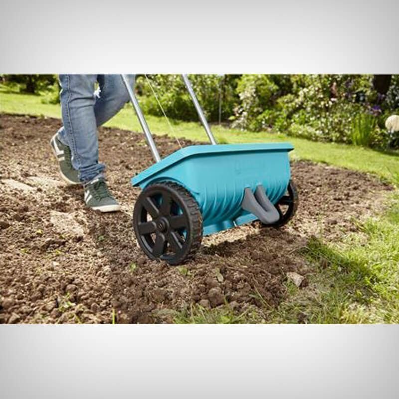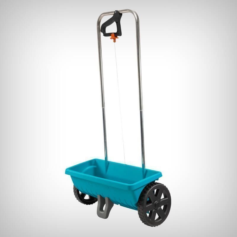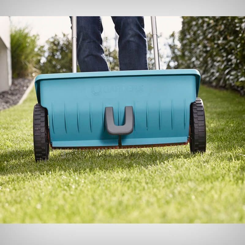 Dispozitivul de imprastiere L Gardena, cu o latime de imprastiere de 45 cm si cu un volum de 12,5 l este adecvat pentru suprafete mari de aproximativ 400m².