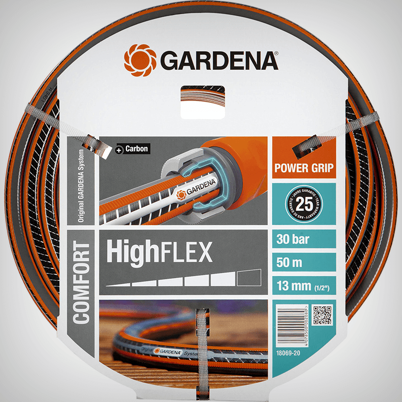 Furtun pentru irigatii Highflex Comfort de la Gardena, rola de 50 metri, diametru 1/2'' (12.5 mm). Produsul este fabricat din PVC tratat, fara ftalati si fara metale grele si este potrivit inclusiv pentru transferul lichidelor alimentare.