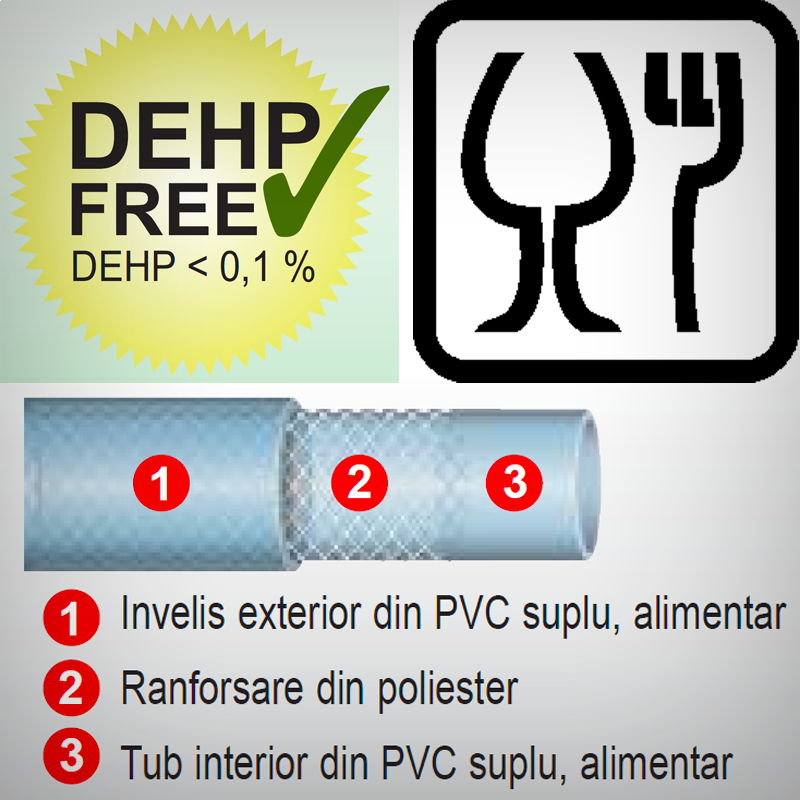Acest tip de furtun este triplustratificat, fabricat din PVC transparent si ranforsat cu fibre de poliester de inalta tenacitate.