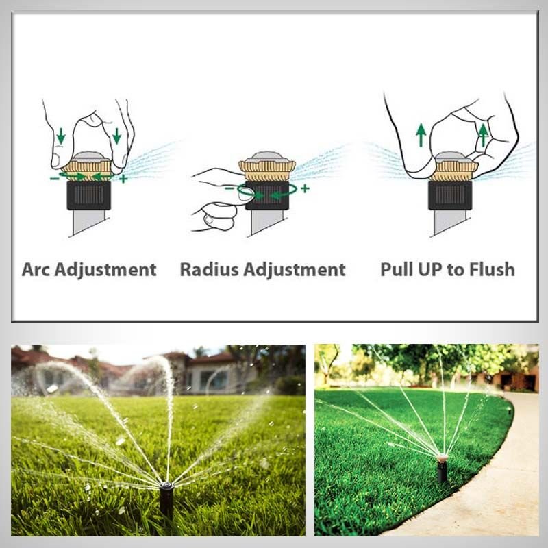 Duzele sunt echipate cu surub din otel inoxidabil pentru reducerea razei de udare - permite o reducere de pana la 4m. Rata de precipitatii potrivita a apei si modelul razei de udare simplifica procesul de design al sistemului de irigatii. Rata de precipitatii de 15.2 mm/hr este compatibila cu modelul duzei pentru rotor Rain Bird 5000/5000 Plus MPR, permitand designuri pentru irigatii MPR de la 4.0 m pana la 7.3 m.