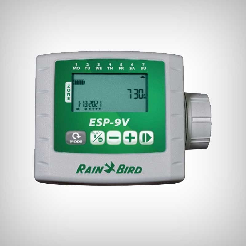 Programatorul pentru irigatii ESP-9V, Rain Bird, pentru 2 zone, ofera avantajul unei structuri rezistente, cu un design inteligent, putand fi folosit in conditii de umiditate, praf, pietris etc. Poate fi montat oriunde, chiar si in cutia pentru electrovane, dat fiind ca nu are nevoie de conexiune la reteaua de electricitate.