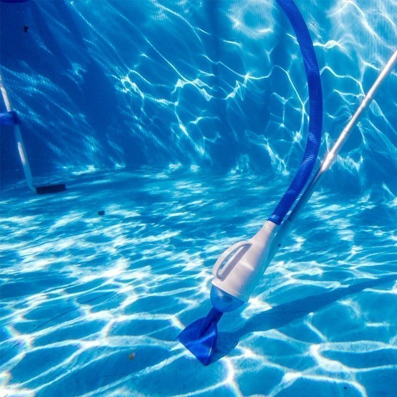 Kitul de curatare pentu piscine supraterane include un cap de aspiratie, 5 m furtun cu diametrul de 32, 3 adaptoare pentru skimmer si maner telescopic (4x40 cm) din aluminiu.
