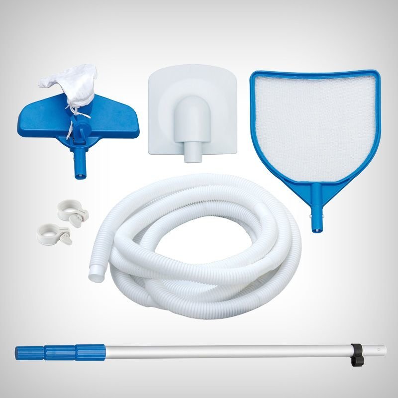 Setul include pompa de filtrare cu un cartus filtrant, scara acces, prelata piscina, folie protectie la sol si kit de intretinere Delux.