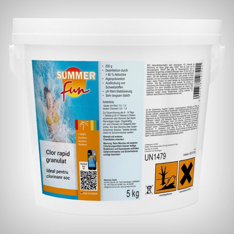 Substanta sub forma de granule, cu continut de clor in proportie de 56%. Cu o eliberare rapida a substantei active, produsul este recomandat pentru tratamentul soc al apei din piscina, fie la inceput de sezon, fie atunci cand apa a fost contaminata de alge. Substanta are efectul scontat doar in conditiile in care pH-ul apei are o valoarea neutra, prin urmare inainte de tratarea apei cu clor va recomandam sa testati si sa reglati nivelul pH-ului.