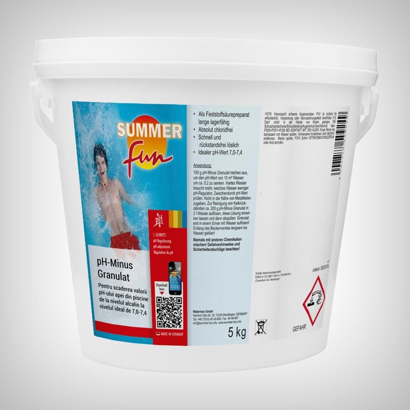 Pentru scaderea valorii pH-ului utilizati compusul chimic pH Minus granulat, pe baza de sulfit acid de sodiu.