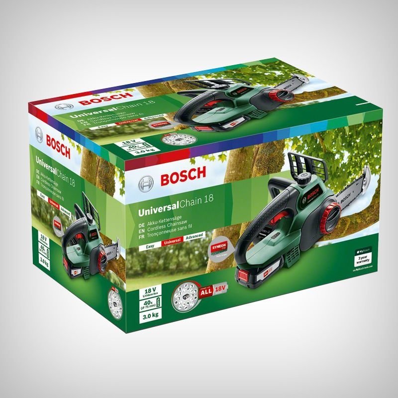 Fierastraul UniversalChain BOSCH 18V este un fierastrau electric cu lant, relativ mic si usor de manevrat, adecvat atat pentru taierea lemnului uscat, cat si pentru intretinerea lemnului verde.