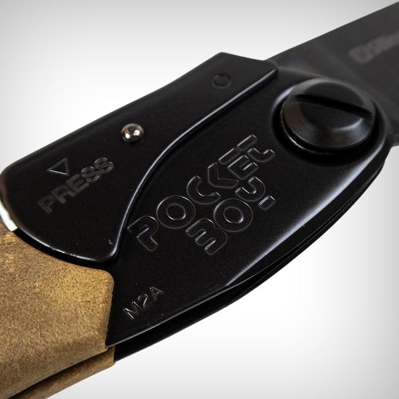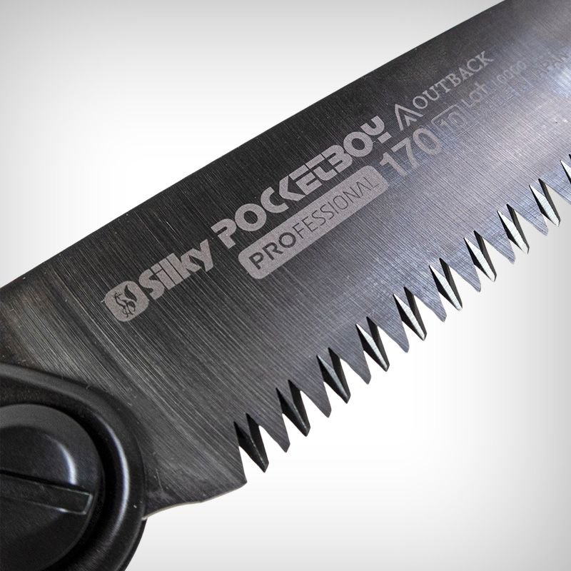 Outback Pocketboy dispune de o lama dreapta cu lungimea de 17 cm, groasa si rigida, (comparativ cu alte fierastraie Silky), placata in intregime cu un amestec de nichel si staniu. Acest lucru ii asigura o durata lunga de viata si performanta la taiere, nu numai in lemn, dar si la taierea oaselor, de exemplu. In plus, culoarea inchisa, nereflectorizanta, face ca acest fierastrau sa fie potrivit si usor de utilizat in operațiuni tactice. Dintii, caliti prin impuls, au o dispunere de 10 pe 30 mm. Modelul Pocketboy este recomandat pentru lemn sau os cu diametrul de pana la 8-9cm.