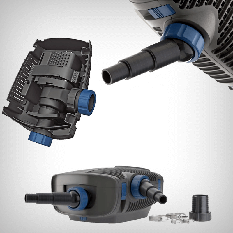 Duza in trepte permite racordarea rapida la furtun cu diametre cuprinse intre 1'' - 1 1/2''. Refularea est prevazuta cu articulatie rotativa bila. Racordul secundar cu reglaj mecanic pentru absorbtie permite conectarea unui skimmer pentru strangerea reziduurilor de la suprafata apei sau a unui filtru satelit pentru absorbtia apei din alta zona a iazului.