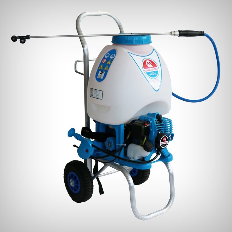 Capacitatea rezervorului este de 25 de litri. Caruciorul poate fi detasat pentru a purta atomizorul in spate.