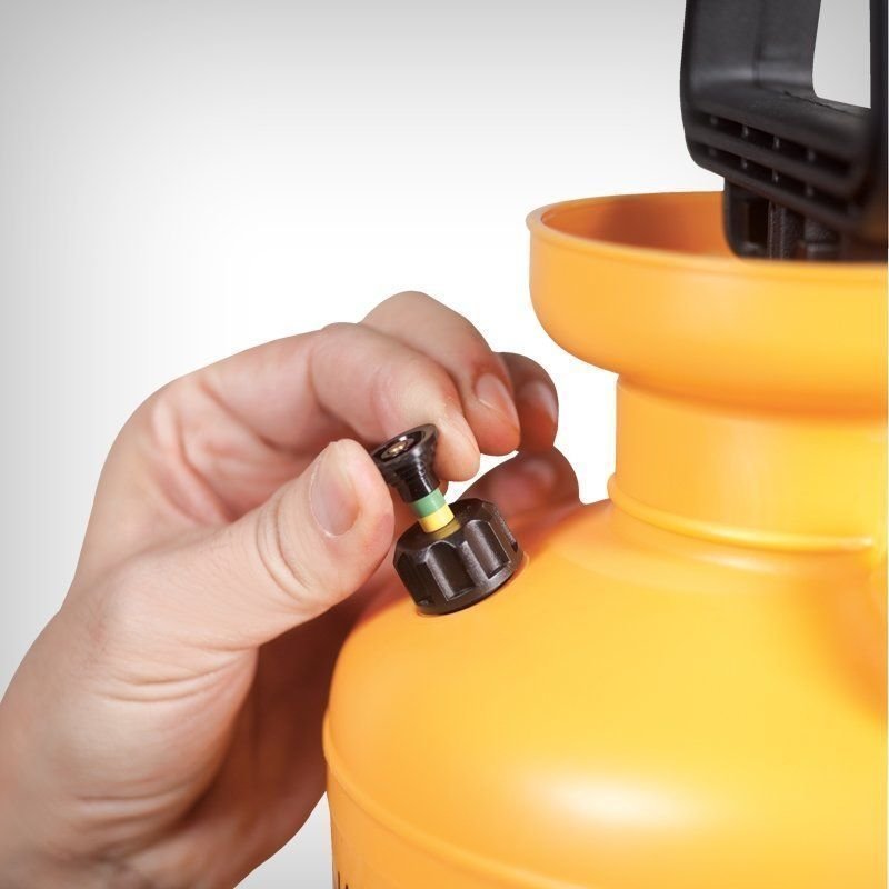 Aparatul este echipat cu supapa de siguranta pentru eliberarea presiunii. Lancea are maner din polietilena cu filtru metalic incorporat; tija este din aluminiu, iar duza de pulverizare este reglabila, fabricata din cupru.
