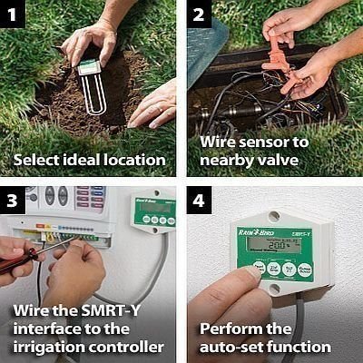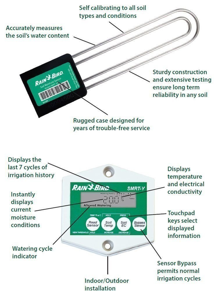 Senzorul de umiditate SMRT-Y de la Rain Bird este un dispozitiv inteligent care se conecteaza la controllerul de irigatii pentru a-i comunica acestuia nivelul de umiditate al solului. Cand senzoul detecteaza conditii de substrat uscat, programatorul permite pornirea urmatorului ciclu de udare setat. De asemenea, ciclul de udare este suspendat atunci cand nivelul de umiditate detectat este peste pragul setat.