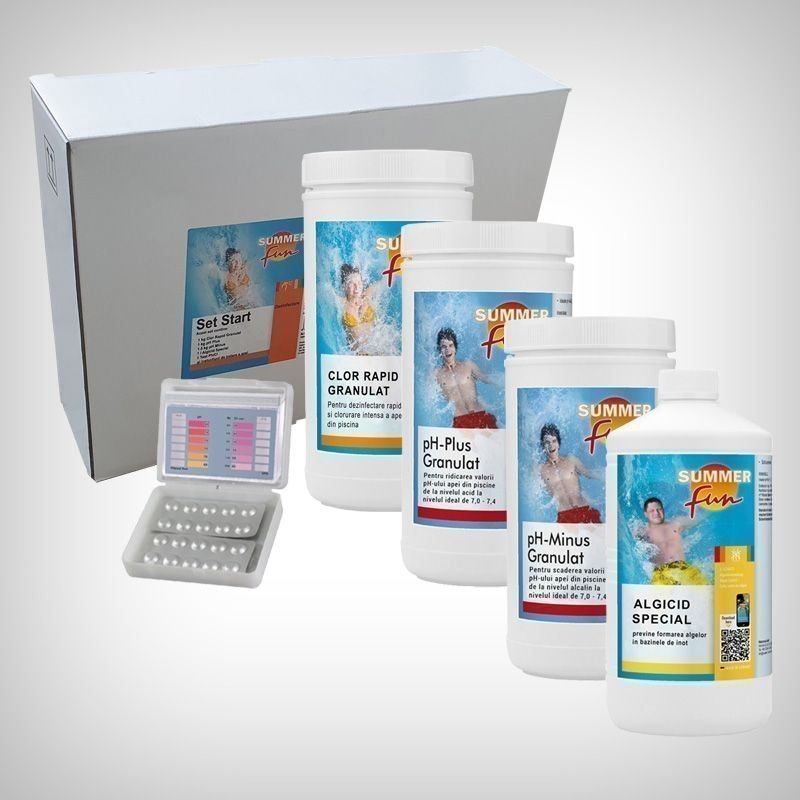 Setul pentru intretinerea piscinei contine cele 5 elemente necesare la inceputul sezonului, atunci cand piscina este repusa in functiune.
