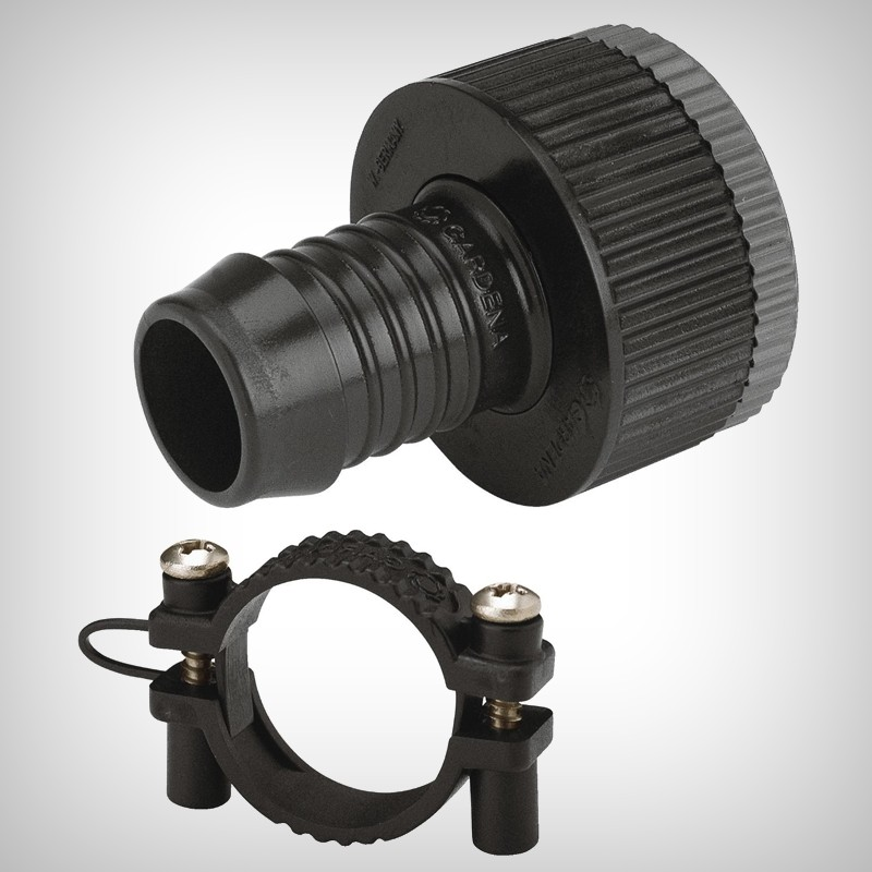 Clema de furtun inclusa in set asigura furtunul. Ca varianta, elementul adaptor poate fi utilizat pentru atasarea unei conducte de conectare de 19 mm (3/4") la o conducta de conectare de 25 mm, prin intermediul conectorului 25 mm x filet exterior 1" GARDENA (nr. articol 2763-20).
