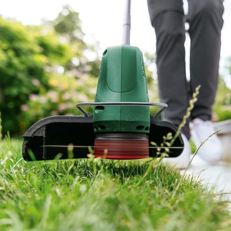 Dotat cu functia EdgeSimple de la Bosch, integrata in manerul superior, trimmerul poate fi comutat usor de la modul de tundere la modul de taiere a marginilor prin apasarea unui buton si prin rotirea marginilor. Trimmerul este totodata prevazut cu o bobina semiautomata care elimina necesitatea efectuarii reglajelor în mod manual.